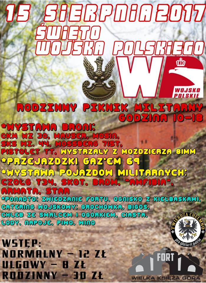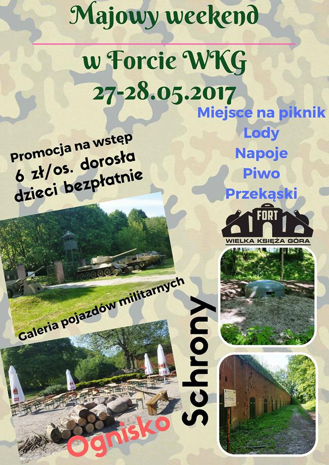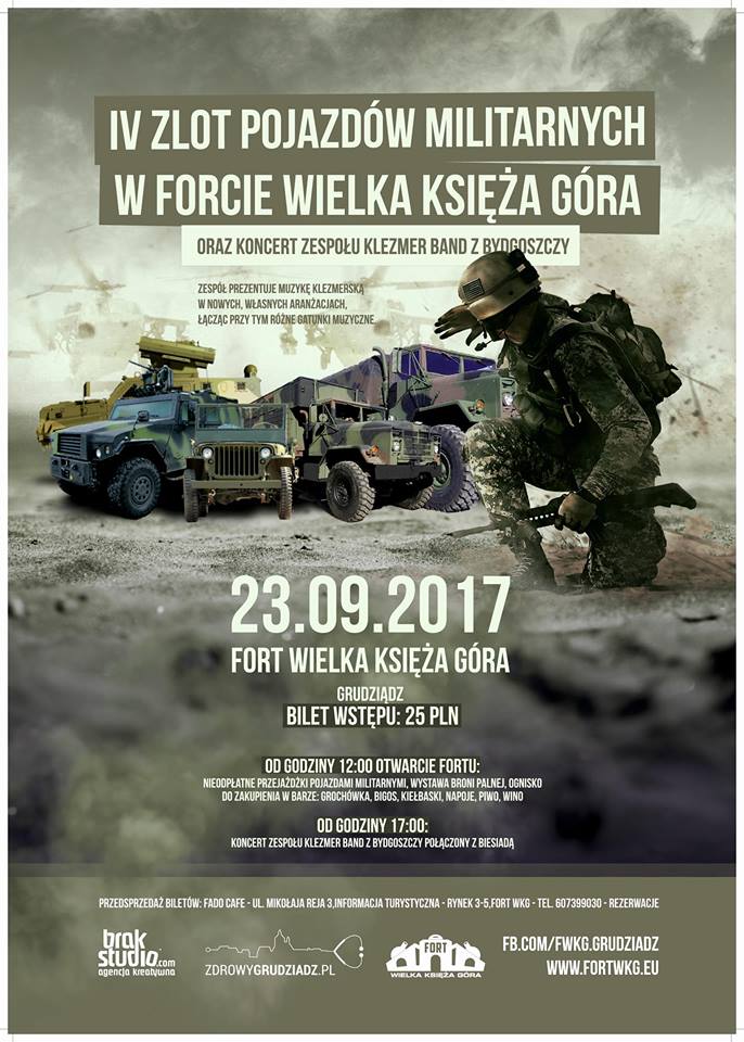 w Forcie Wielka Księża Góra zwieńczony koncertem Klezmer Band z Bydgoszczy. Bilet wstępu na powyższą imprezę: 25 zł/os., Dla dzieci do 11 roku życia ulgowo 8 zł :) Program imprezy: Od godziny 12:00: 1. Nieodpłatne przejażdzki pojazdami militarnymi 2. Wystawa broni palnej z różnych epok 3. Ognisko Do zakupienia w barze: Grochówka, Bigos, kiełbaski na ognisko, napoje, piwo, wino Od godziny 17:00: Koncert zespołu Klezmer Band z Bydgoszczy połączony z biesiadą. Bilety do nabycia w FADO CAFE, INFORMACJI TURYSTYCZNEJ ORAZ W BIURZE FORTU WKG - REZERWACJE NR TEL. 607399030 Przed zlotem w Forcie WKG zapraszamy przed godziną 11-tą do CYTADELA GRUDZIĄDZ na zwiedzanie z przewodnikiem. Możliwe noclegi w Marina Grudziądz , Hotel Rudnik, ibis Styles Grudziadz, Hotel RAD a następnego dnia można wybrać się do Mega Park - Rodzinny Park Rozrywki oraz wypic przepyszna kawke w FADO CAFE na Rynku;) Polecamy weekend w Grudziądz !