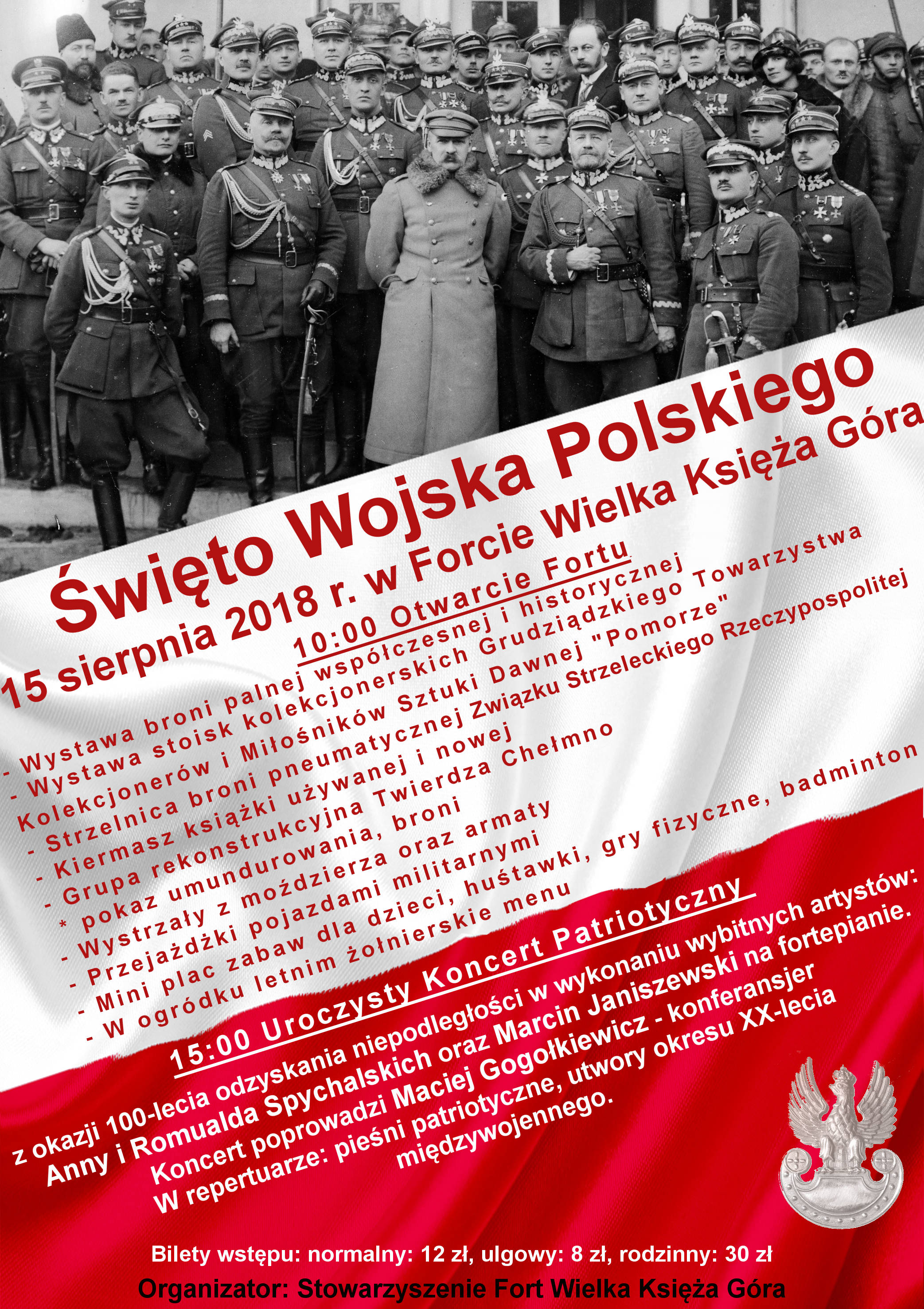 * W tle muzyka rozrywkowa* Mini plac zabaw dla dzieci - huśtawki, gry fizyczne jak rzuty w tarczę, badminton* Ognisko,* W barze żołnierskie menu, napoje chłodzące15:00 Uroczysty Koncert Patriotycznyz okazji 100-lecia odzyskania niepodległości w wykonaniu wybitnych artystów: Anny i Romualda Spychalskich oraz Marcin Janiszewski na fortepianie. Koncert poprowadzi Maciej Gogołkiewicz- konferansjer. W repertuarze pieśni patriotyczne oraz utwory okresu XX-lecia międzywojennego.Wstęp płatny na miejscu: Normalny 12 zł, ulgowy 8 zł, rodzinny 30 zł